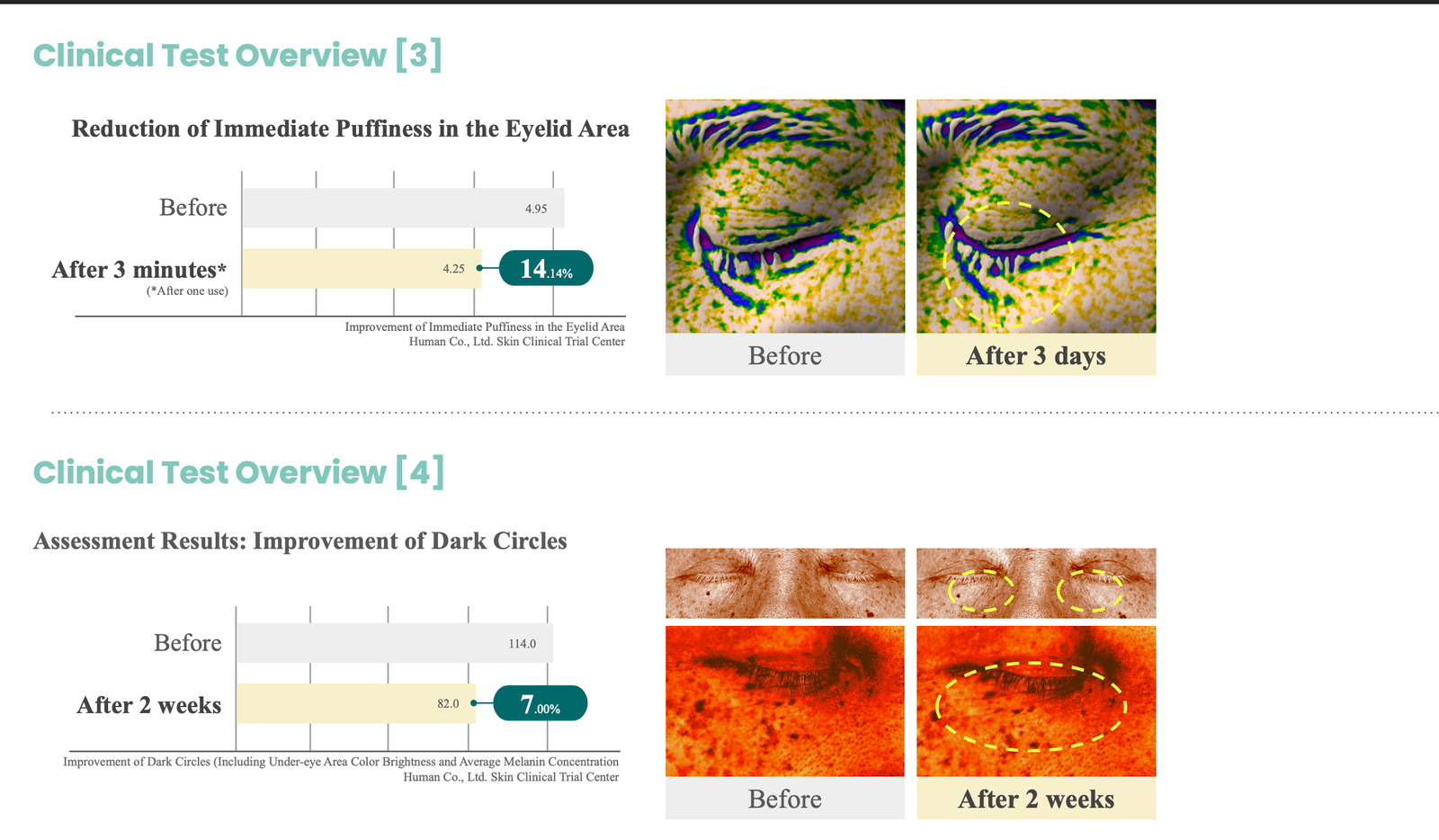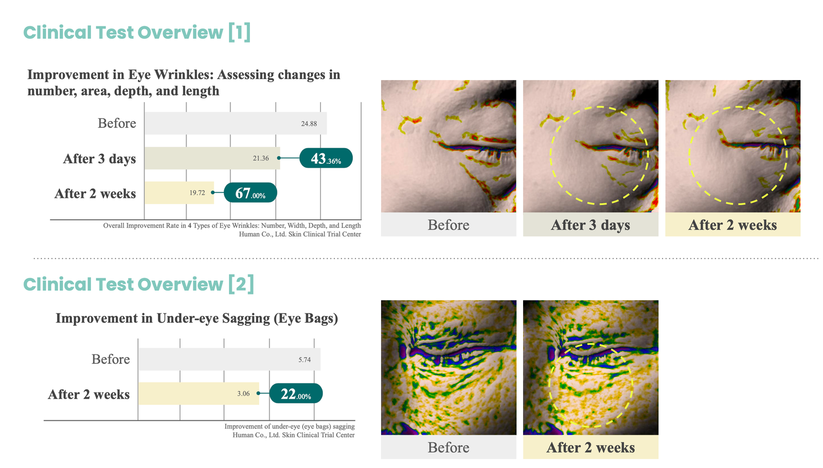 - Clinical trials have indicated immediate and long-term benefits of our product. Within just 3 minutes of use, there’s a 14% reduction in eye swelling, demonstrating an immediate effect. Over a period of two weeks, there’s a 22% improvement in under-eye sagging and a 7% reduction in dark circles. These results contribute significantly to revitalizing dull eyes, giving them a brighter and more youthful appearance.